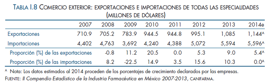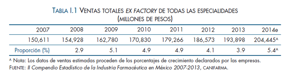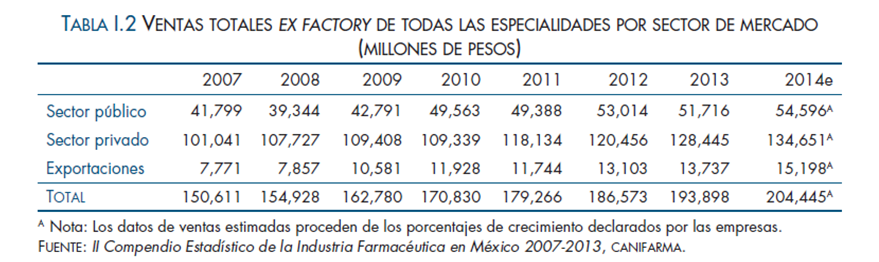 De acuerdo con los datos proporcionados por las empresas afiliadas, en el periodo 2007-2013 el valor de las ventas de todas las especialidades de la Industria Farmacéutica al sector público, tuvieron un crecimiento con una tasa anual compuesta de 3.6%, mientras que en el mismo lapso el sector privado presentó un crecimiento anual compuesto de 4.1%, en tanto que las exportaciones manifestaron un crecimiento a una tasa anual compuesta de 9.9% durante el periodo comprendido de este ejercicio.