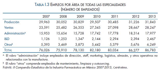 Entre el 2007 y el 2013 el empleo de todas las especialidades productivas afiliadas a CANIFARMA mostró un incremento del 14.1 % en sus empleos, generando 10,757 plazas más, para registrar 86,783 empleos totales en 2013.