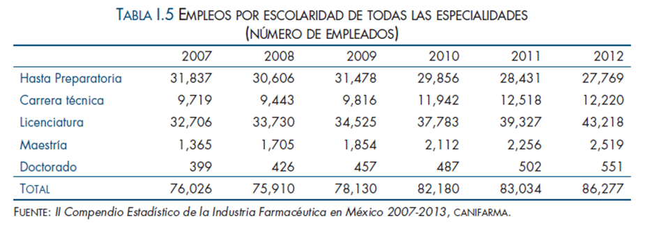 Esto no solamente se da por el continuo incremento de las actividades de ID, sino por muchas otras funciones de soporte a esta actividad económica que requieren cada vez mayor conocimiento especializado. Como se observa en la tabla I.5, los trabajadores con Posgrado que colaboran en la Industria Farmacéutica se incrementaron 74.0%, al pasar de 1,764 en 2007 a 3,070 en 2012.