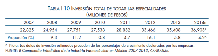 La inversión que la industria afiliada a CANIFARMA realiza en México no ha dejado de crecer; durante el periodo 2007-2013 este sector productivo generó más de 200 mil MDP de inversión, lo que equivale a un incremente de 55.1% entre lo invertido el primero y el último año señalado.